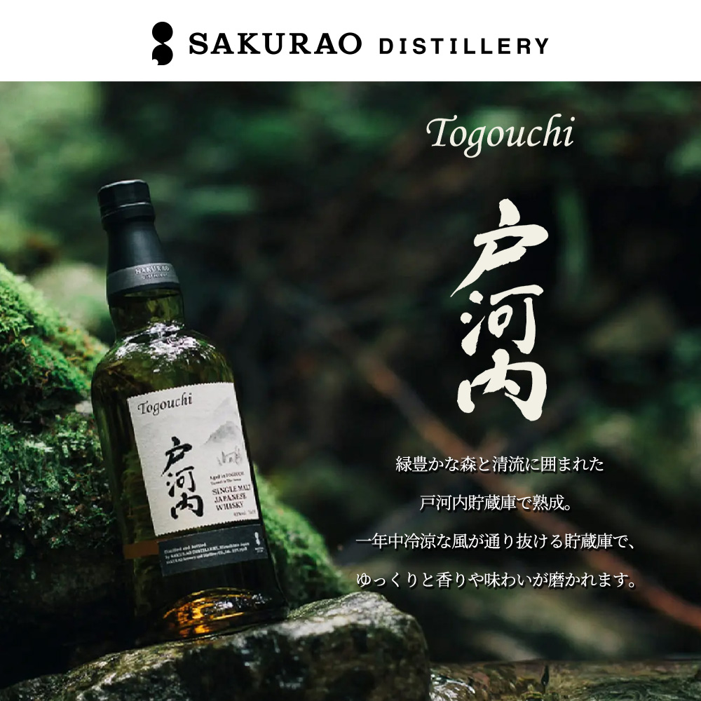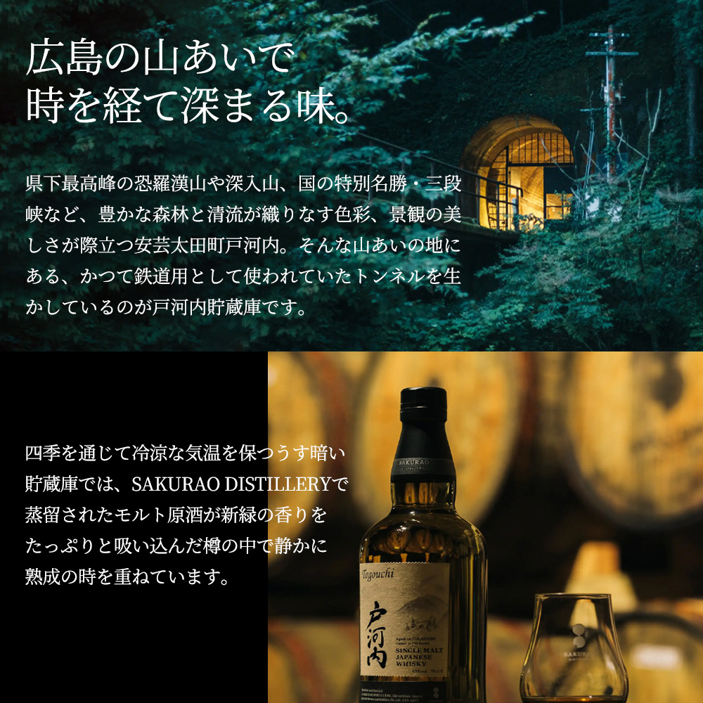 【商品説明】広島の山あいで時を経て深まる味!!県下最高峰の恐羅漢山や深入山、国の特別名勝・三段峡など、豊かな森林と清流が織りなす色彩、景観の美しさが際立つ安芸太田町戸河内!! そんな山あいの地にある、かつて鉄道用として使われていたトンネルを生かしているのが戸河内貯蔵庫です!!四季を通じて冷涼な気温を保つうす暗い貯蔵庫では、SAKURAO DISTILLERYで蒸留されたモルト原酒が新緑の香りをたっぷりと吸い込んだ樽の中で静かに熟成の時を重ねています!! シングルモルト戸河内!!は清流に囲まれた戸河内トンネル貯蔵庫で3年以上熟成したバーボン樽使用!!一年中冷涼な風が通り抜ける貯蔵庫で、ゆっくりと香りや味わいが磨かれます!! 黄金色!!バニラ、リンゴ、マーマレード、メロンの香り!!味わいは軽快でスムースな口あたり、すっきりとした甘さ!!フィニッシュは爽快で穏やか、キレのある余韻が特徴!!