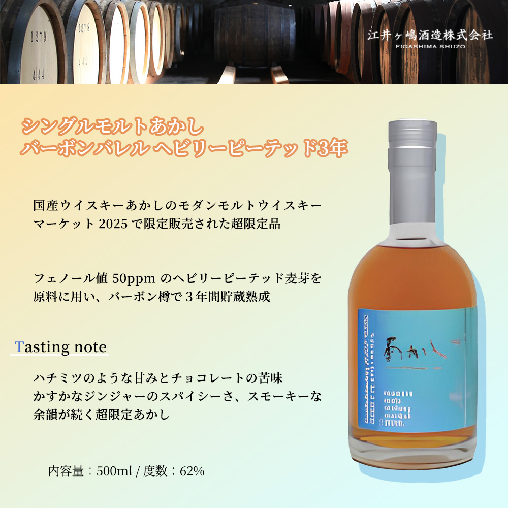 【商品説明】日本のウイスキーの歴史と共に歩み、当たり前のことを真面目に守り抜き、心を込めて造られた江井ヶ嶋酒造!!国産ウイスキーあかし!のモダンモルトウイスキーマーケット2025で限定販売された超限定品!!シングルモルトあかしバーボンバレルヘビリーピーテッド3年!!超限定入荷!! フェノール値50ppmのヘビリーピーテッド麦芽を原料に用い、バーボン樽で3年間貯蔵熟成!!ハチミツのような甘みとチョコレートの苦味!!かすかなジンジャーのスパイシーさ、スモーキーな余韻が続く超限定あかし!!ぜひご賞味ください!!