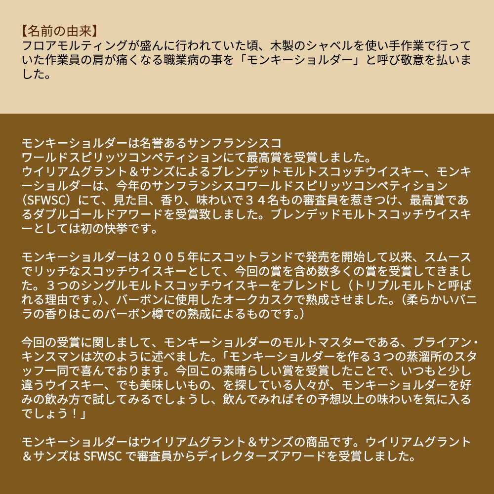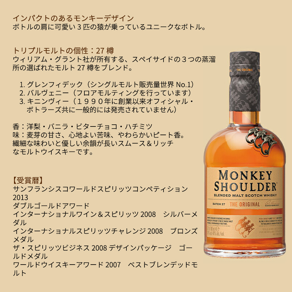 【商品説明】超希少!ブレンデッドウイスキー愛好家大注目!ボトルに可愛い3匹の猿のメタルが乗っているユニークなボトルデザインの、ウィリアムス・グラント社が所有するスペイサイドの大人気蒸留所3つの選ばれたモルト27樽が贅沢にブレンドされた究極の逸品!ブレンデッド・モルト!その名もモンキー・ショルダー! その3つの蒸留所とは、シングルモルト販売量世界NO.1の“グレンフィディック”!とフロアモルティングを行っている“バルヴェニー”!そして1990年に創業以来オフィシャル、ボトラーズ共に発売されていない幻のモルト“キニンヴィ”がブレンドされている究極ブレンデッドウイスキー! 琥珀のカラー!ハチミツ、バニラ、洋梨といった甘いアロマに、ビターチョコといったスパイシーなアロマ!麦芽のような甘い味わいに心地よい苦味が最高のバランスを生み出している究極モルト・ウイスキーが入荷!