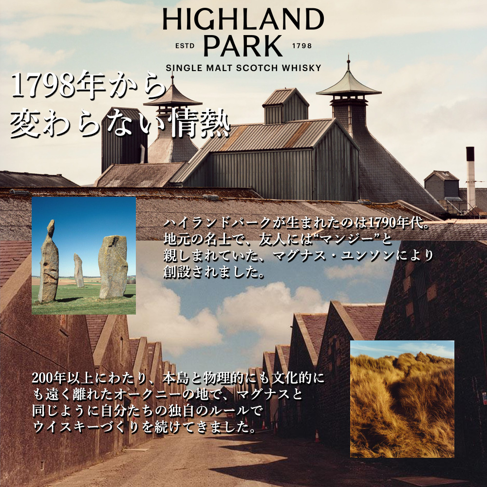 【商品説明】ハイランドパークを唯一無二たらしめるオークニーの味!!新石器時代の名残とヴァイキングの影響を映すオークニー島で、1798年以来、頑なに伝統を守り続ける、権威あるシングルモルト・スコッチウイスキー!!ハイランドパーク!! オークニーの素晴らしい自然環境、 そして職人の妥協なきクリエイティビティを最大限に表現された新しいハイランドパーク!!出発地点であるオークニーの類まれなる環境を、これまでのウイスキーにはない型破りな方法で表現!! ハイランドパーク18年は職人の手により選ばれたファーストフィルのヨーロピアンオークシェリーカスクで熟成することによるスパイスと濃厚なフルーツの香り!!リフィルカスクとアメリカンオークのシェリーカスクによる類まれなるバランスが特徴!!18年の特徴である濃厚さは、ブーダンノワールのようなリッチ味わい!! ソーセージ、ナッツをふんだんに使ったチョコレートサラミなどメインからデザートと幅広い食事に良く合います!!クリアで明るく光沢のあるゴールドカラー!!香りははちみつ漬けのエキゾチックフルーツ、円熟した花の香り!!味わいはフルーツジャムとエスプレッソのクリーミーさの中にスパイス!!フィニッシュは甘い余韻が長く続き、ハーバルな終わりを迎える余韻が長く続く!!