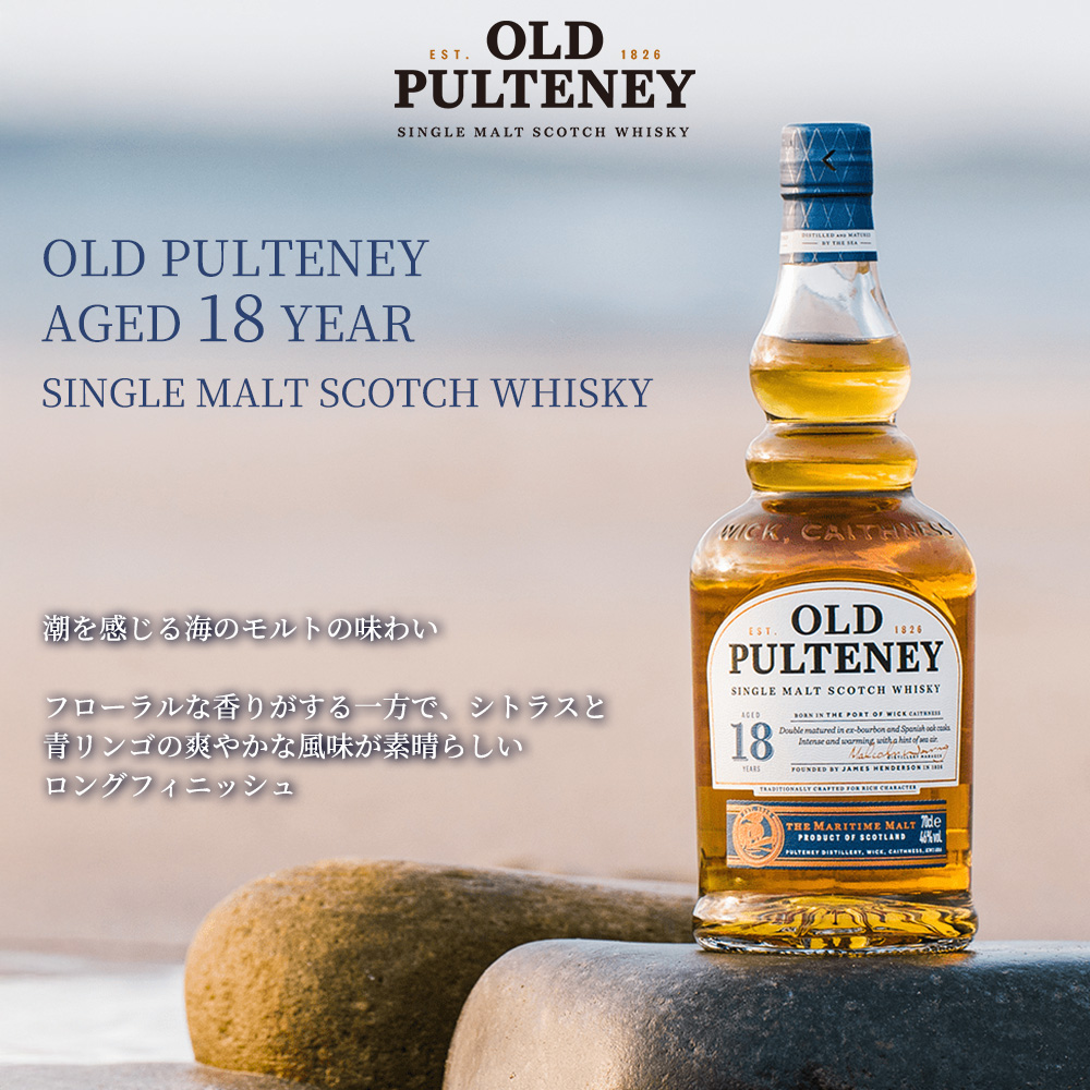 【商品説明】1826年スコットランド北部ハイランドの港町ウィックに創業した、最も古い蒸溜所の1つ!!プルトニー蒸溜所!!最北端に近い蒸留所でかつてニシン漁で栄えた町で、現在も海の文化が根付いています!!海辺の貯蔵庫で、潮風を受けながら熟成されるため“海のモルト”と称され、北海から吹く潮風と熟成環境が育む、塩気、オイリー、そしてスパイシーな風味が特徴的なシングルモルトを生産しています!!特徴的なボトル形状は、独特な形状のポットスチルに由来しています!!シングルモルト オールドプルトニー 18年!!はセカンドフィルアメリカンオークのバーボン樽で熟成後、ファーストフィルスパニッシュオークのオロロソ樽にてさらに熟成!!ディープアンバーカラー!!香りは濃厚で温かみがあり、チョコレートとクリーミーなバニラの香り、そしてリッチなハニーな甘さをすっきりとしたスパイスが和らげる!!花のようなフルーティーさからシトラスとアップルの爽やかさに変化していく!!味わいは潮を感じる海のモルト!!さらに溢れるほどのチョコレートの風味がはちみつがけのスパイスとクリスマスケーキと折り重なる!!フローラルな香りがする一方で、シトラスと青リンゴの爽やかな風味が素晴らしいロングフィニッシュに華やかさを与える!!