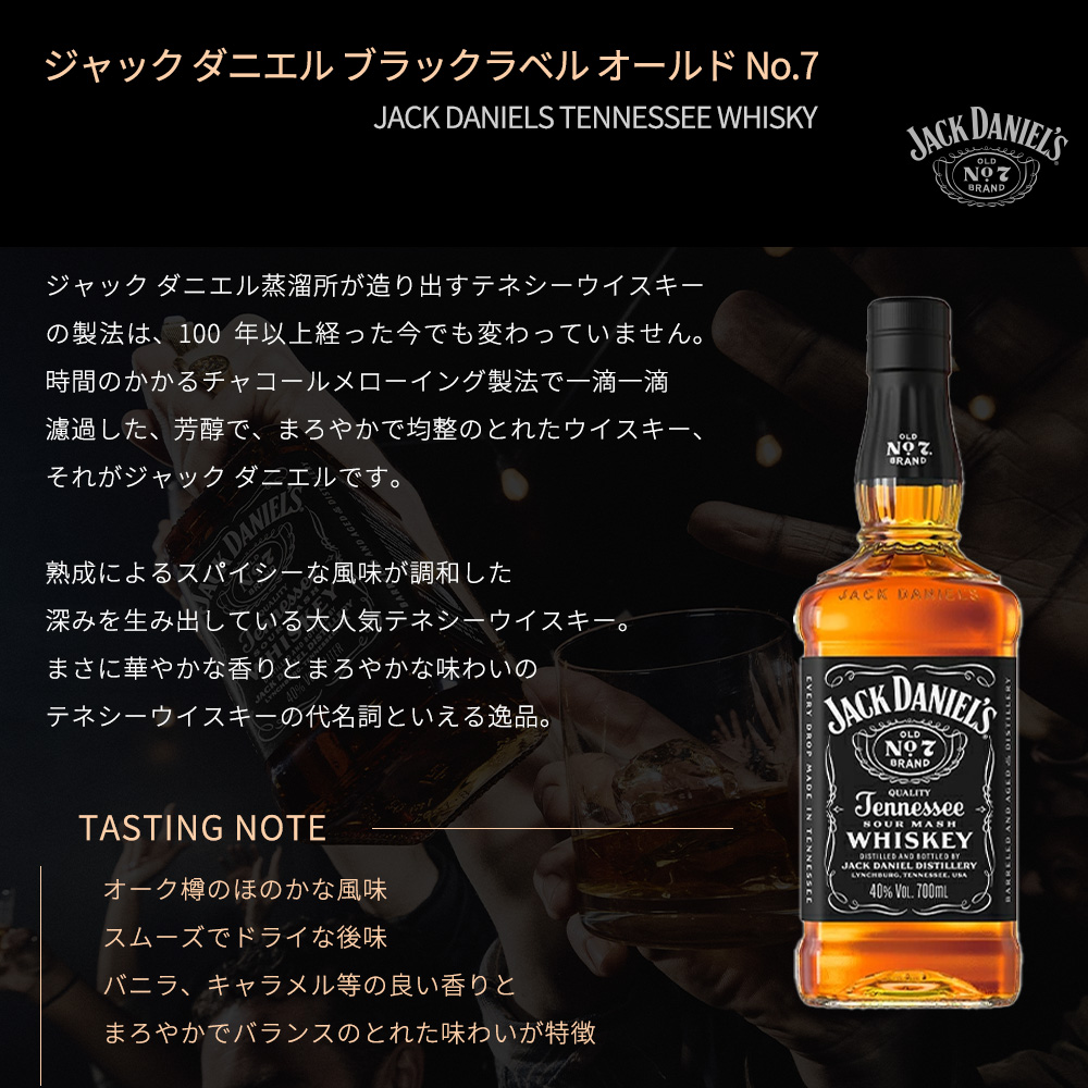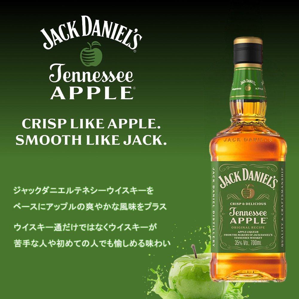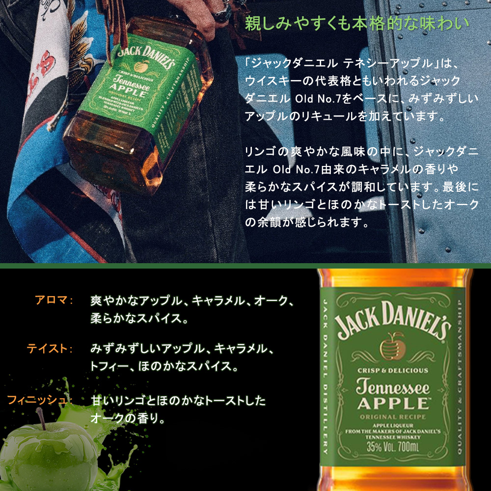 【商品説明】世界で最も有名なテネシーウイスキー!!1866年創業!!テネシー州で唯一稼働している大人気蒸留所!!ジャック・ダニエル蒸留所!!より大人気リキュール!!とブラックラベル・オールド No.7の飲み比べセット!!ジャックダニエルアップルの限定Tシャツ付き! ジャック・ダニエル・テネシー・アップルジャックダニエルテネシーウイスキーをベースにアップルの爽やかな風味を加えたリキュール!ウイスキーが苦手な層やいつもとは違う味わいを体験したい人に! ジャックダニエルをベースに、アップルの爽やかな風味を加えたアップルウイスキー!アップルの爽やかな香りと味わいに、ジャックの芳醇でまろやかな個性を受け継いだ、ウイスキー通だけではなくウイスキーが苦手な人や初めての人でも愉しめる味わい!リンゴの爽やかな風味の中に、「ジャックダニエル Old No.7」由来のキャラメルの香りや柔らかなスパイスが調和しています!最後には甘いリンゴとほのかなトーストしたオークの余韻が感じられます! シリーズの中で一番バランスの取れた味わいで大人気!!ジャックダニエル・ブラックNo.7!!オーク樽のほのかな風味!!スムーズでドライな後味!!バニラ、キャラメル等の良い香りとまろやかでバランスのとれた味わいが特徴!!熟成によるスパイシーな風味が調和した深みを生み出している大人気テネシーウイスキー!!まさに華やかな香りとまろやかな味わいのテネシーウイスキーの代名詞といえる逸品!!