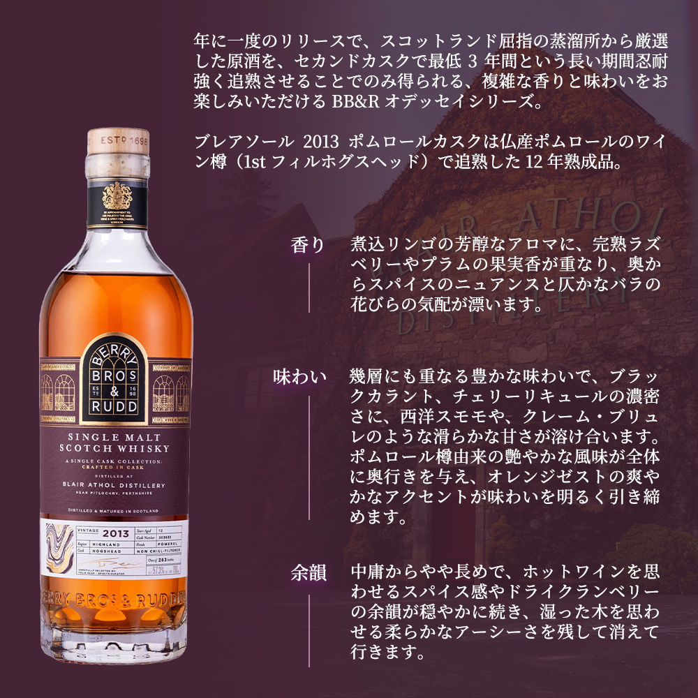 【商品説明】初入荷!!シングルカスクのカスクストレングスボトリング!!BB&Rオデッセイシリーズ!! ウイスキーの香味にとって重要なファクターである“カスク”への探求および、“カスク”を通じた熟成の旅を意味し、ベリー・ブラザーズ&ラッド社が自社で別の樽へ移し替え(リラッキング)、同社が目指す味わいへとつくり上げたウイスキーのシリーズ!!年に一度のリリースで、スコットランド屈指の蒸溜所から厳選した原酒を、セカンドカスクで最低3年間という長い期間忍耐強く追熟させることでのみ得られる、複雑な香りと味わいをお楽しみいただけるシリーズ!! ブレアソール2013ポムロールカスクは仏産ポムロールのワイン樽(1stフィルホグスヘッド)で追熟した12年熟成品!! 香りは、煮込リンゴの芳醇なアロマに、完熟ラズベリーやプラムの果実香が重なり、奥からスパイスのニュアンスと仄かなバラの花びらの気配が漂います!!口に含むと幾層にも重なる豊かな味わいで、ブラックカラント、チェリーリキュールの濃密さに、西洋スモモや、クレーム・ブリュレのような滑らかな甘さが溶け合います!!ポムロール樽由来の艶やかな風味が全体に奥行きを与え、オレンジゼストの爽やかなアクセントが味わいを明るく引き締めます!!フィニッシュは中庸からやや長めで、ホットワインを思わせるスパイス感やドライクランベリーの余韻が穏やかに続き、湿った木を思わせる柔らかなアーシーさを残して消えて行きます!!