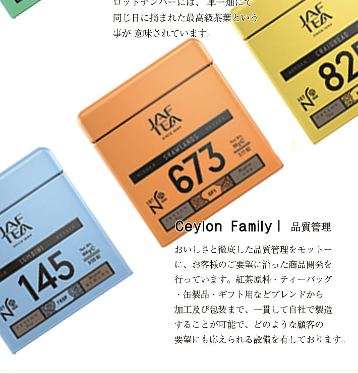 ![]() この限定品は、最高の味わいの紅茶をお届けするために JAFTEA(ジャフティー)の熟練紅茶テイスターが、最高峰の単一畑や自家農園の良質な茶葉を選び抜きました。それぞれの缶についているロットナンバーには単一畑にて同じ日に摘まれた最高級茶葉という事が意味されています。このこだわり抜いた茶葉で作られた紅茶は、産地の特徴と、味わい深い個性にあふれた最高級のセイロンティーに仕上がっています。毎週、7人のトレーニングを受けた経験豊富なティーテスターの チームが、コロンボティーオークションで12,000サンプル以上の ティーを慎重に評価し、バイヤーの厳しい要件を満たすティーのみ を選択しています。 ![]() すべてのお茶は、厳格な衛生的お よび衛生的な条件に準拠して、 150,000平方フィートを超える、 当社の近代的な倉庫複合施設に保 管されています。茶葉の包装に使用されるすべての 材料は、食品包装基準に従って同 様の条件で保管されています液体と顆粒の両方の私たちのすべ てのフレーバーは、一定の温度と 低い湿度を確保するために、空調 された空調された貯蔵施設で貯蔵 されます。 美味しい紅茶は産地で決まる。 お米だったらどうでしょうか…新潟県の魚沼産こしひかりも有名ですよね。 緑茶だったら…静岡県の川根町産など産地が有名です。 ワインだったら…フランスのジロンド県、ボルドー地区産が有名...。 さてこの特産地に、他の産地のものを混ぜるとどうでしょうか、 例えば新潟産コシヒカリにタイ産のお米をブレンドする... これではその産地のおいしさを100%味わうことは出来ないのではないでしょうか。 紅茶も例外にもれず「産地」がとても大事です。 現在日本で販売されている紅茶は各国ブレンド(インド、中国、ケニア、インドネシア) の紅茶が多く出回っています。 JAFTEA は1944年の創業以来一貫して「セイロンティー100%」にこだわり抜いた 数少ない正統派のスリランカ紅茶メーカーです。 |