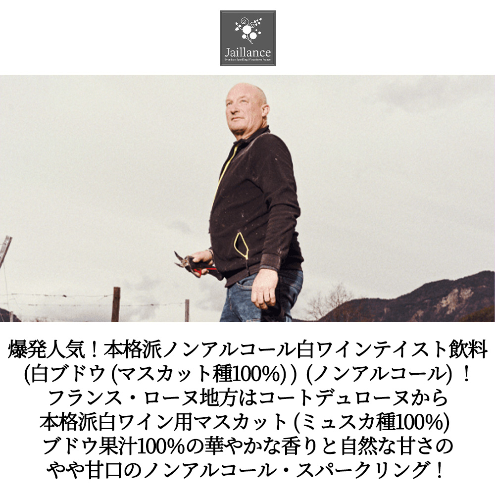 【商品説明】今、爆発人気!ノンアルコール白ワインテイスト飲料 (ノンアルコール) 白ブドウ (マスカット種100%から) 愛好家大注目!フランス・ローヌ地方はコートデュローヌから本格派白ワイン用マスカット (ミュスカ種100%) ブドウ果汁やや甘口のノンアルコール・スパークリング!「飲酒運転をなくしたい」そんな想いから生まれたアルコール0%のノンアルコールのミュスカ種100%白ワインテイスト飲料です!飲めない時にうれしい!飲めない人にうれしい!今、人気のブドウ果汁100%のノンアルコール・スパークリング!本格派白ワイン用マスカットブドウ果汁で造られたノンアルコール・シャンパンスタイル・スパークリングジュース! しかも造り手は1950年にコートデュローヌ中部、ディー村の協同組合としてスタート!2001年に会社名を「ジャイアンス」に改め、その他の地域のスパークリングの生産にも着手しました!クレマン・ド・ボルドーを生産するブール・シュール・ジロンド村の醸造所を買収、その後もヴーヴレやクレマン・ド・ブルゴーニュの優良生産者とパートナー契約を結び、ジャイアンスブランドとして様々なスパークリングワインをリリースしています!現在ジャイアンスは22カ国へ輸出され、シャンパーニュを除くAOCスパークリングのフランス国内シェアもNo1を誇るトップブランドへと成長を遂げています! ずばり、フランスAOCスパークリングのシェアNo.1を誇るジャイアンス社による白ワイン用品種ミュスカ100%の果汁を使用 (ミュスカ種のブドウ果汁を熱殺菌しフィルターをかけ低温貯蔵!ボトル詰め前に水、炭酸ガス等を加えて製造。) した、華やかな香りと自然な甘さのミュスカ100%の果汁100%のノンアルコールのシャンパンスタイルのスパークリング飲料!
