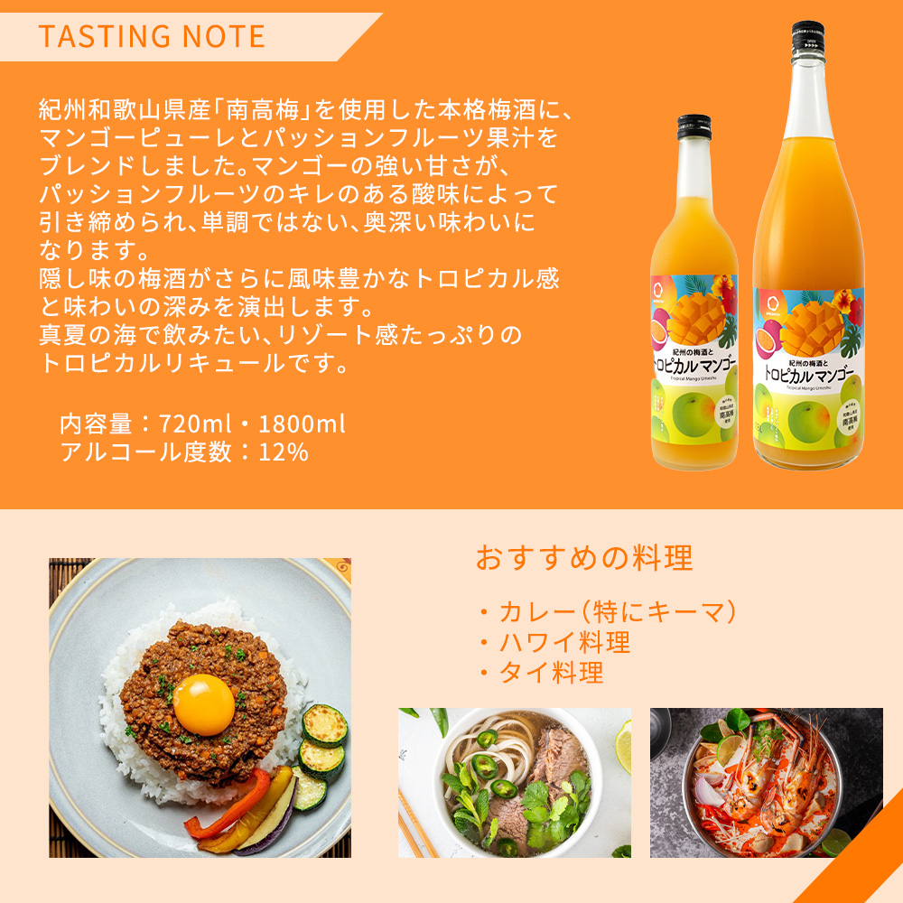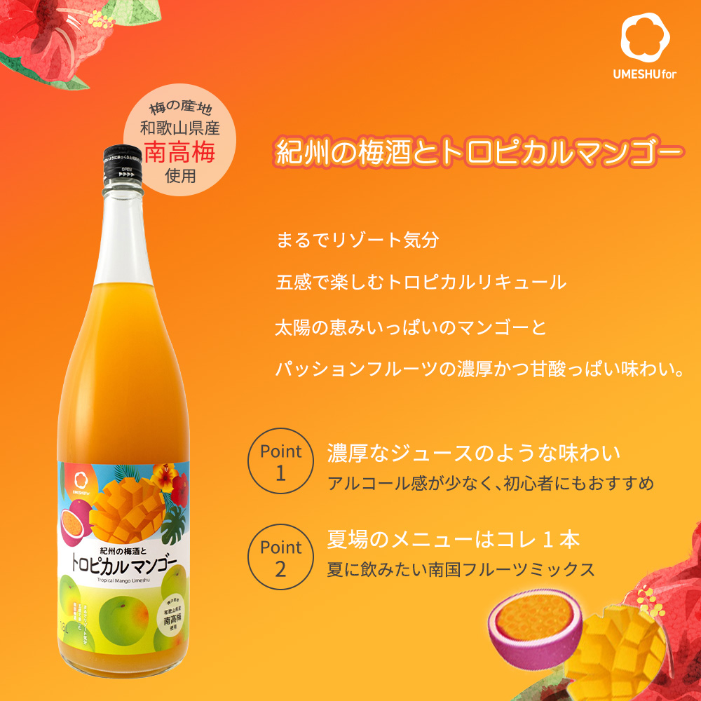 【商品名】中野BC・紀州の梅酒とトロピカルマンゴー・リキュール・1800ml・1.8L・12%【商品説明】まるでリゾート気分!五感で楽しむトロピカルリキュール!太陽の恵みいっぱいのマンゴーとパッションフルーツの濃厚かつ甘酸っぱい味わい!紀州和歌山県産「南高梅」を使用した本格梅酒に、マンゴーピューレとパッションフルーツ果汁をブレンドしました!マンゴーの強い甘さが、パッションフルーツのキレのある酸味によって引き締められ、単調ではない、奥深い味わいになります!隠し味の梅酒がさらに風味豊かなトロピカル感と味わいの深みを演出します!真夏の海で飲みたい、リゾート感たっぷりのトロピカルリキュールです!