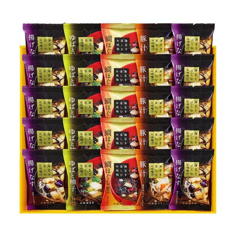 数種類の味噌を海苔に合うようブレンドしたお味噌汁とお吸い物の詰合せです。お湯を注ぐだけで、国産豚を使用した「豚汁」や上品な味わいの「ゆばと柚子」などをお楽しみいただけます。