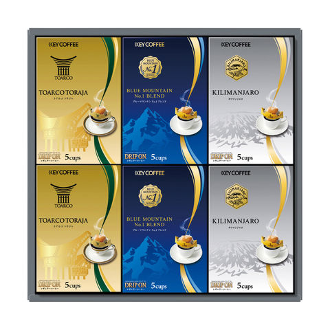 〈キーコーヒー〉だけのプレミアムなコーヒー「トアルコ トラジャ」や、「ブルーマウンテンNo.1ブレンド」などを詰め合わせた上品なコクと香りの「ドリップオン」ギフトです。