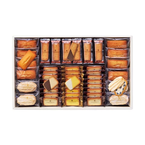 | 内容 | レーズンサンド×4、フィナンシェ・ラングドシャシトロン×各8、ラングドシャショコラ×16、ビスキュイオショコラ×12 |