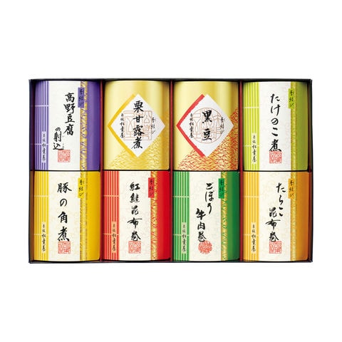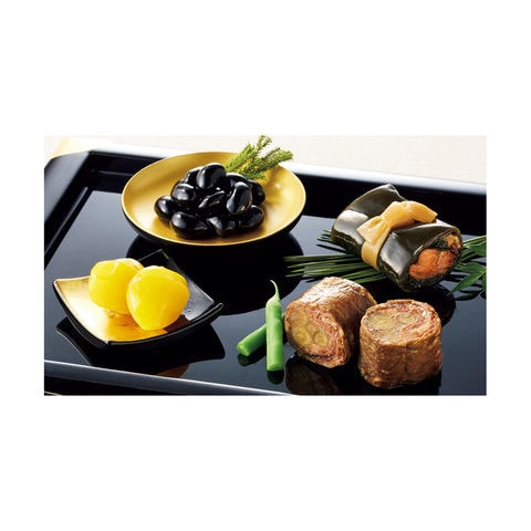 | 内容 | 黒豆30g、栗甘露煮・たけのこ煮・高野豆腐の射込各40g、豚の角煮60g、ごぼう牛肉巻・紅鮭昆布巻・たらこ昆布巻各1本 |