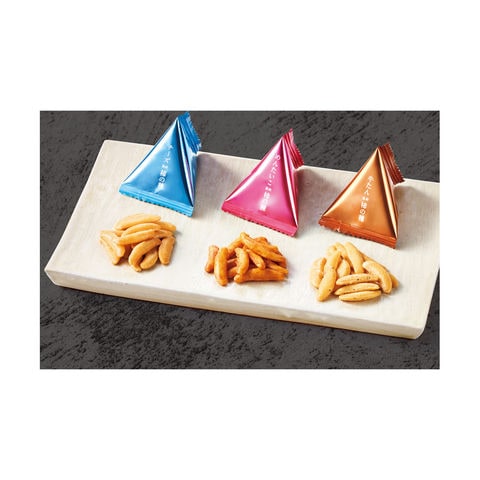 牛たんやチーズ、めんたいこやもんじゃ焼きなど、バラエティー豊かな4種の風味の柿の種を詰め合わせました。食べきりサイズの三角パックでお届けします。