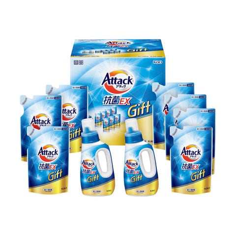 たくさんの洗濯物を洗う場合でも、汚れ・臭い・菌に浸透して洗浄力を発揮します。持ちやすくて注ぎやすいボトルの「アタック抗菌EX」ギフトです。