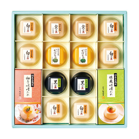 | 内容 | 白胡麻豆腐×6、金胡麻豆腐・かぼちゃ胡麻豆腐・黒胡麻豆腐×各2、各43g、柚子味噌たれ・胡麻味噌たれ各7g×各6/賞味期間:常温で240日 |