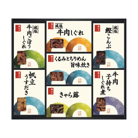 | 内容 | 減塩牛肉しぐれ・減塩牛肉ごぼうしぐれ・減塩鰹こんぶ・牛肉子持ちしぐれ煮・くるみとちりめん旨味炊き各50g、帆立うすだき40g、きゃら蕗60g/原産国:牛肉:国産 |