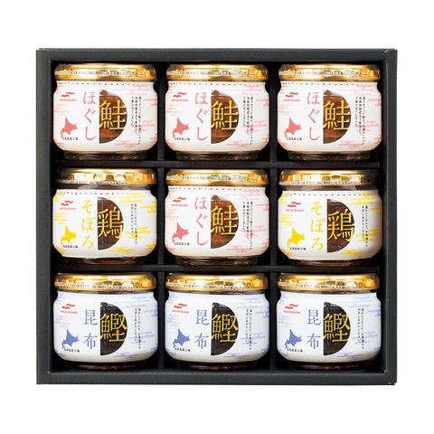 | 内容 | 鮭ほぐし×4、鰹昆布×3、鶏そぼろ×2、各45g |
