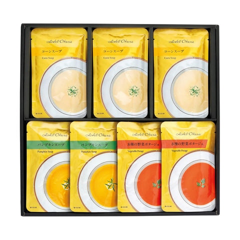 | 内容 | コーンスープ×3、パンプキンスープ・8種の野菜ポタージュ×各2、各120g |