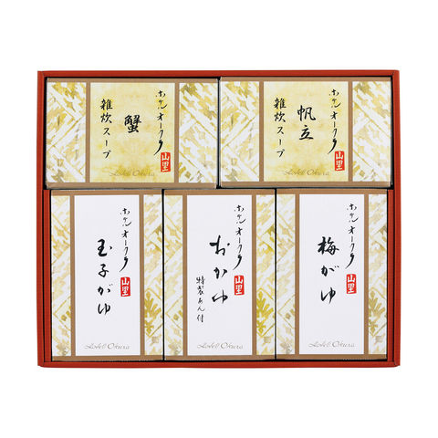 | 内容 | 蟹雑炊スープ・帆立雑炊スープ・梅がゆ・玉子がゆ・おかゆ(特製あん50g付)各250g/原産国:日本国 |