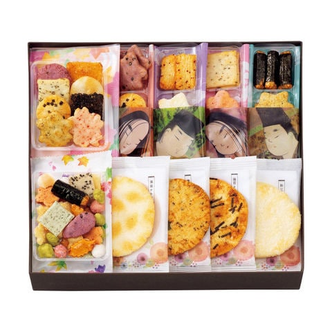 | 内容 | さくら紅葉・花うららけし×各1袋、源氏歌あわせ×6袋、月まどか(海苔とだし醤油・藻塩サラダ×各5、青磯の香り×4、和三盆蜜がけ×3)/原産国:国産 |