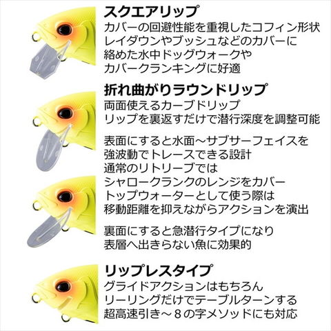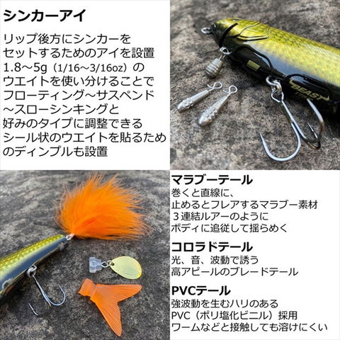 「ビッグベイトをはじめたいアングラーへ、まず手にしてほしいルアー」をコンセプトに開発されたビースト175F。専用タックルでなくとも、MHクラスであれば投げられて、ビッグベイトとしての“魚を引っ張る力”を備えた、175mm、54gというサイズ感。2種のリップ、3種のテール、そしてシンカーアイによって、10パターン以上のカスタムができる。つまり、ひとつのルアーで、・ビッグサイズのトップウォータープラグでありながら、・サブサーフェイスをトレースできるノイジー系にもなり、・ウエイトを足せばS字軌道のグライドアクションも演出できて、・ギラギラとヒラを打つ水中ドッグウォークもこなし、・カバークランキングにも対応する。2種のリップ(各2枚)、3種のテール(各1個)、そして、これらをまとめて収納できる専用のベイトパックをセットしたパッケージ。