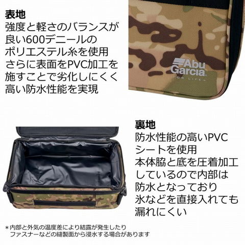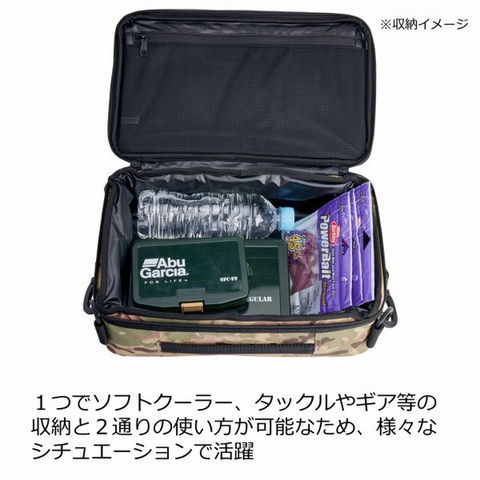ソフトクーラーとして使用可能で、用途に応じてタックルやギアの収納などマルチユースの兼用クーラーバッグ。食材やドリンクなどを収納するソフトクーラーとタックルやルアーケースを収納するボックスを分けておくことが可能。1つでソフトクーラー、タックルやギア等の収納と2通りの使い方が可能なため、様々なシチュエーションで活躍。このケースをバッカンや他のボックス等に立てたり平置きで収納しても、スムーズに取り出しやすいようハンドルは蓋上部とマチ面の2か所に配置。ショルダーストラップ付きで肩掛けにも対応。ショルダーベルトを使用しないときは、紛失防止のため本体のループに通しておくことが可能。本体底面には自転車等の荷台に取り付けられるベルトループを備え、上蓋内側には保冷剤などを入れられるメッシュのポケットを備えている。メインとなる表生地は、強度と軽さのバランスが良い600デニールのポリエステル糸を織り上げ、表面には劣化しにくく防水性能の高いPVC加工を施している※製品は完全防水仕様ではない。内部は防水となっており氷などを入れても漏れにくい仕様。