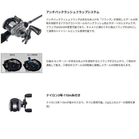 バックラッシュを恐れるな。アンチバックラッシュフラップ搭載でベイトキャストリールの使い方を学べる。フラップをONにすればバックラッシュ防止をサポート、OFFにすれば通常のBCリールとしても使用可能なため、初めてBCリールとしてオススメです。重量(g):233