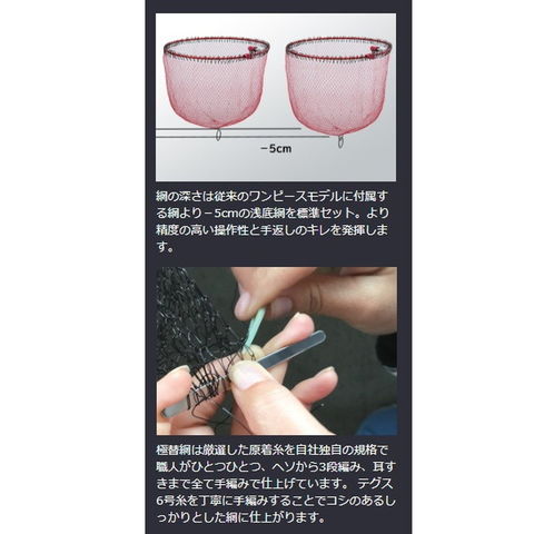 折り畳み機構搭載!湾港エリアのランガンスタイルに!!強靭・軽量な極ワンピースモデルに、元祖折り畳みタモジョイント「フレックスアームVer.II」の機能を融合。コンパクト収納が可能になり、湾港エリア等でのランガンスタイルに最低なワンピースモデルへと進化しました。タモ網も従来の装着網より-5cm浅底の網をセッティング。携帯性・機動力を備え、抜群の操作性と手返しのキレも発揮します。サイズ(枠径):45cm