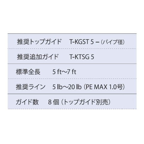 ガイド数:8個(トップガイド別売) 標準全長:5ft~7ft 推奨ライン:5lb~20lb(PE MAX1.0号) ※標準全長より長いブランクスの場合は、推奨ガイドをティップ部分に追加してください。