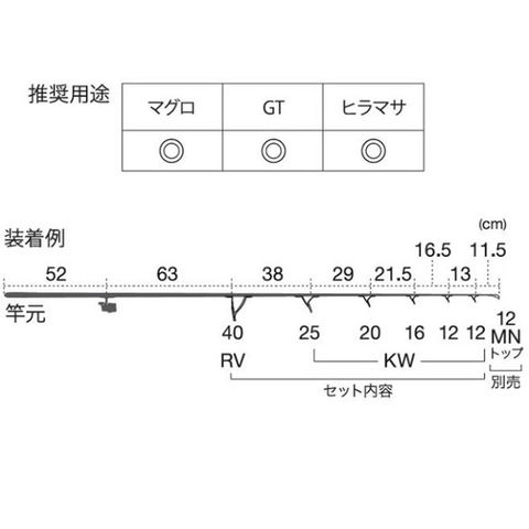 ガイド数:6個(トップガイド別売) 標準全長:7.5ft~8.5ft 推奨ライン:80lb~120lb(PE 4~6号) ※標準全長より長いブランクスの場合は、推奨ガイドをティップ部分に追加してください。