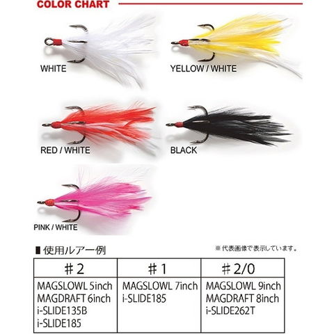 サイズ:#2 入数:2本入 使用ルアー例:MAGSLOWL 5inch, MAGDRAFT 6inch, i-SLIDE135B, i-SLIDE185 オリジナルロングフェザーフックは、アクションの安定性を向上させるだけでなく、フックの存在感を希薄化し、揺らめくフェザーでスプーキーな魚をバイトに持ち込みます。 ※掲載している商品の画像は代表画像を表示しています。また実物と色が違って見える場合があります。あらかじめご了承下さい。