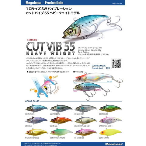Length : 55mm Weight : 13g Type : Sinking メガバスがソルト専用として新たに開発した「CUT VIB」。バイブレーション最大のウィークポイント、バラシとミスバイトを激減させた、画期的なモデルです。カットバイブ55はエッジの立った背中で、水流を鋭くカット。さらに、独自のショートビルが適切に水流をつかみつつ、抵抗水流をカット。超デッドスロー~ハイスピードリトリーブまで、キレのあるハイピッチバイブレーションを実現しました。 ※掲載している商品の画像は代表画像を表示している場合があります。また実際と色が違って見える場合があります。あらかじめご了承ください。