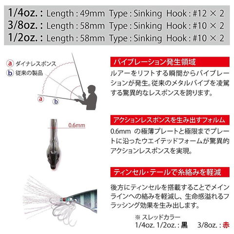 Length : 49mm Weight : 1/4oz. Type : Sinking Hook : #12 × 2 ダイナレスポンスは、鬼の塾長こと、佐藤信治プロデュースのニューコンセプトメタルバイブ。水キレの良い0.6mmの極薄ステンレスプレートと、極限までプレートに沿ったウエイテッドフォームが驚異的な立ち上がりと強波動を生み出します。メガバス独自のハイドロダイナミクスボディがまったくリトリーブストレスを感じさせないキレのあるハイピッチアクションを実現。ティンセル・テールは本体の振動に追従し、生命感あふれるフラッシングを発生。圧倒的な明滅アピールでビッグバイトを誘発。メタルバイブ特有の着水やフォール時に多発するライン絡みトラブルも大幅に軽減化させています。広域フラッシュ&ハイピッチバイブレーションを驚異的な立ち上がりの早さで生み出すダイナレスポンスの快適な使い心地は異次元です。