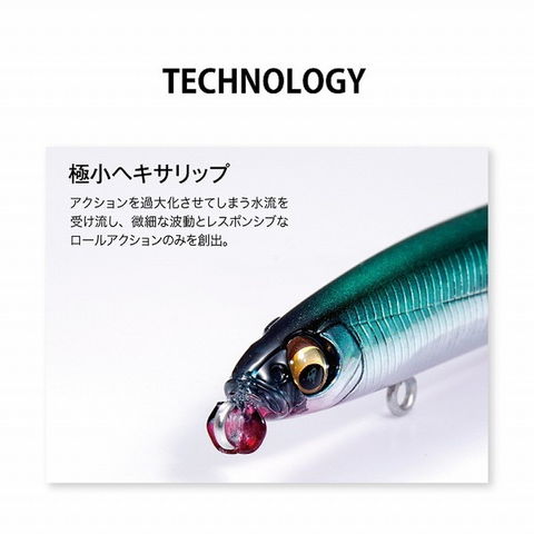VATISSAの極小ヘキサリップは、アクションを過大化させてしまう水流を受け流し、微細な波動とレスポンシブなロールアクションのみを創出。リトリーブ速度とロッドティップを高低させる調整で、微弱な引き波を生みながらの水面引きや水面直下のロールアクションなど、意のままに表層引きにおける誘いのコントロールが可能。 VATISSAは、卓越したエアロダイナミクスとマグネティック重心移動システムにより、スーパースリムボディの常識を覆す、圧巻のロングディスタンス・キャスタビリティを実現。 新機軸スリムベイト、VATISSAの卓越したアジャスタビリティと通常のミノーでは太刀打ちできないタフな状況下での圧倒的な誘引力は、湾岸のシーバスゲームを一変させます。