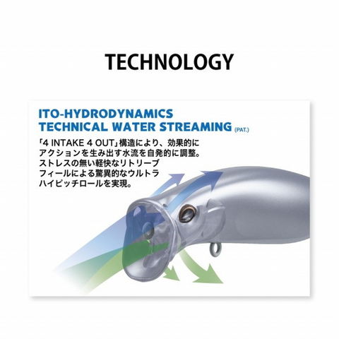 KIRINJIは、POPXやPOPMAXのウォータースルー機構(PAT.)を導入したスペシャルウェイクベイト。ITOのハイドロダイナミクス、「4 INTAKE 4 OUT」構造により、効果的にアクションを生み出す水流を自発的に調整。ストレスの無い軽快なリトリーブフィールによる驚異的なウルトラハイピッチロールを実現しています。だからKIRINJIは、あらゆる波の状況や潮流において、超低速域から超高速域によるピックアップまで、常に安定したウォブンロールで泳ぎ切り、バイトチャンスを多発させます。また、KIRINJIはポッパーとしての使用でも存分に活躍。ウォータースルー機構によりバブルを纏うスライドやスプラッシュを発生し、アクティブにターゲットを誘います。従来のウェイクベイトを超えた、多彩なアプローチを可能とするウェイクベイトの革命児がKIRINJI「麒麟児」なのです。