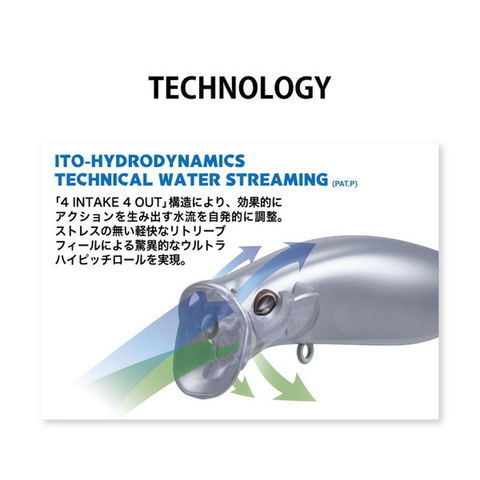 KIRINJI 120 は、ITO 独自のハイドロダイナミクス「4 INTAKE 4 OUT」構造(PAT.P)を搭載したスペシャルウェイクベイト。水流加圧を増大させた大型ウォータースルーダクトにより、ロングボディでもキレのあるウェイクアクションを実現。必要な水流を自発的に調整して取り込み、ストレスの無い軽快なリトリーブフィールで、ターゲットを誘引する驚異的なウルトラハイピッチロールを披露。またKIRINJI 120 は、浮力を抑えたセッティングにより、ロッドティップを水面近くに構えたリトリーブでは水深10cm 程度のシャローランナーとしても活躍。ベイトの浮き具合、水面の光量、アップクロスやダウンクロスなど、状況に合わせてベストレンジを探っていくことが可能です。さらに、ペンシルポッパーとして「バブル&スプラッシュ」、「バブルダイブ&リトリーブ」など、ルアージャンルの枠を超えた多彩なアプローチが可能。ウェイクベイトの革命児です。 ★ 全長:120mm