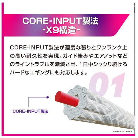 圧倒的感度と適度な張りがエギングを変える!◆CORE-INPUT製法 X9構造 CORE-INPUT製法が適度な張りとワンランク上の高い耐久性を実現。ガイド絡みやエアノットなどのライントラブルを激減させ、1日中シャクり続けるハードなエギングにも対応します。◆Vertical Braid工法(縦編み)Vertical Braid工法により抜群の直進性と3%台という超低伸度化に成功。小さなアタリも確実にアングラーに伝えます。また、抜群の直進性により、潮・風の影響を受けにくく、キャストアキュラシーを高めます。◆SP-T2コーティング ライン表面を樹脂膜で覆うSP-T2コーティングにより、耐久性が大幅にアップし、吸水もしにくい構造になっています。水切れ性能が向上することで、キレのよいシャクリが実現し、エギの操作性がアップします。◆フォーリングバイトマーカー搭載。視認性に優れたマーキングシステムを搭載することで、エギへのアタックをラインの動きで捉えます。フィネスなエギングに適した仕様です。 ★ 号数:0.6号