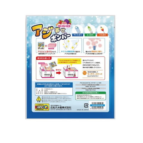 煙幕の効果で食いつきUP。簡単!アミエビと混ぜるだけ。サビキ釣り、カゴ釣り、ウキ釣りに※フルーティーな香り※キララ&煙幕効果で遠方のアジを引き寄せる!※軽いので滞留性に優れ、アジをその場にとどめます。溶けたアミエビに「アジ寄せボンバー」を混ぜ、お好みの固さになるように海水を入れて調節してください。「もっちり、ふわっと」仕上げるのがコツです! ★ 内容量:500g