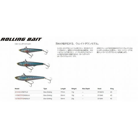 Length:99mm Weight:25g 攻めの幅が広がる、ウェイトダウンモデル。シャローエリアをじっくりと探りたい。河川をドリフトで攻めたい。港湾エリアの水深のある場所を、スローなフォールで探りたい。ノーマルモデルではフォールが速すぎる時に活躍するのが、ローリグベイトLW(ライトウェイト)です。近年のフィールド状況を踏まえたライトウェイト化はレスポンスの向上にも寄与し、スローリトリーブでも艶かしいローリングアクションを発揮します。※掲載している商品の画像は代表画像を表示しています。また実物と色が違って見える場合があります。あらかじめご了承下さい。