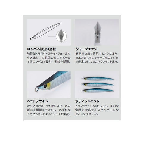 九州・玄界灘「達喜丸」監修のセミロングジグ。ロンバス(菱形)形状がもたらす強烈なヒラ打ちとスライドフォールが広範囲の魚にアピールし、ターゲットの捕食本能を呼び覚ます。日本刀のようにシャープなエッジと、絞り込まれたヘッド部により、水の抵抗を極限まで減らし、わずかな入力でもキレのあるジャークを実現。スタンダードなセミロングボディは、ヒラマサやブリはもちろん、多彩な魚種に対応。この一本で幅広い状況をカバーできる信頼のオールラウンダージグ。全長(mm):180