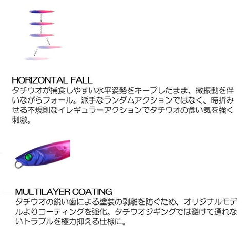 リアに付属した極小ブレードの波動やフラッシングを喰わせのキーとしつつ開発した通常版のヤミージグTG。だが、ブレードを取った状態でのタイトアクションがタチウオに対して効果絶大だったため、専用モデルとしてカラーラインナップ等を再編。超高比重タングステンボディでシルエットは極めてコンパクト=小さなベイトを捕食するタチウオに対して高いバイト誘発能力を発揮。基本のワンピッチはもちろんのこと、ショートピッチでの上げ&テンションフォールでの喰わせ能力は特筆すべきポイント。全国各地の湾内で主流となりつつあるタングステンジグを用いたタチウオジギングに強く推せるシリーズとなった。全長(mm):83