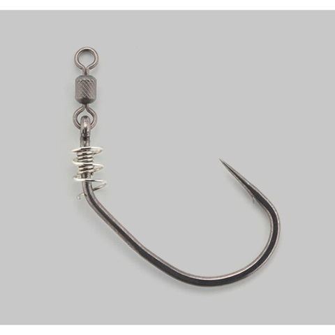 ワームへの負荷が大きいアプローチを繰り返すカバーネコリグの釣りにおいて、最も負荷が掛かるキーパー部にサスペンションキーパーを採用しています。コイル状のキーパーがフックの軸を中心にワーム全体をホールドする為、キャスト時や障害物を回避する際の衝撃を吸収し、ワームの損傷を極限まで抑えることに成功しました。また、カバー越しや遠投でのアプローチなど、フッキングパワーがダイレクトに伝わりにくい状況を考慮し、確実にフックアップへ持ち込める角度設計となっています。