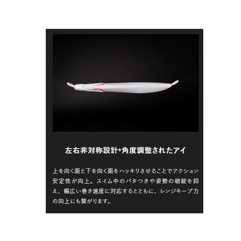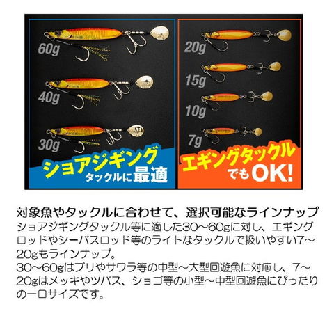 ただ巻きでOK 扱いやすさにこだわったブレードジグ。●ただ巻きOKのカンタン操作。ジャーキング・シャクリなどの難しいアクションは必要とせず、ただ巻きだけでオートマチックに釣れるアクションを演出し、青物を魅了します。操作感や飛距離、トラブルレス性能にも徹底的にこだわり、より快適に・より簡単に堤防青物を攻略することができます。●ハイバランス設計で快適な使用感。堤防・沖堤防での使用を想定し、ボディ・ブレード・アイ・フック・その他パーツに至るまで様々な要素でベストバランスを追究。安定した姿勢で低速~高速巻きまで対応するうえ、狙ったレンジを外し難く、足場の高い堤防でも足元近くまで巻き続けられる高いレンジキープ力を持ちあわせます。※最適なアクションを出すため、角度調整されたアイを採用しています。開封時のままご使用ください。●止めていても誘い続ける。フリーフォール・テンションフォール中もしっかりとブレードが回転し続けるため、ただ巻き後に「止め」を入れた際にもブレードが誘い続け、見切る隙を与えることなくバイトに持ち込むことができます。全長:-