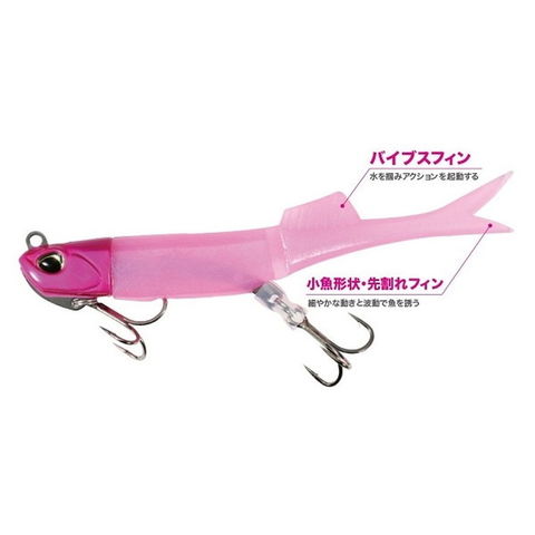 シャッド、グラブに続く第三の波動。小魚をイメージさせるスリムなシルエットと尾部の先割れフィンとボディ中央の体節と背中のバイブスフィン(背ビレ)が、新しいハウルフィッシュの特徴。薄い体節でボディを区切るだけでなく、背中のバイブスフィンで水を受けることで、後ろ半分が細かく高速微振動(バイブレーション)してヒラメを誘う。横流れを受けてターンする際は、体節より後ろが一瞬、大きく曲がって、アクションが変化して喰わせに繋がる。ワームマテリアルを見直したことに加えて、体節からテールまでが薄い設計のため、テールがブレずに飛んで飛距離がアップ。同時に糸絡みも軽減。