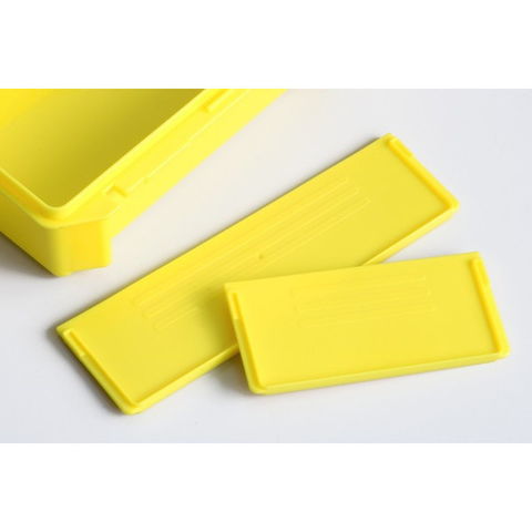 サイズ:205×145×60mm、 素材:ポリプロピレン(本体)/ABS(止具)、 カラー:イエロー(本体)/ネイビー(止具)、 仕切板:2種付属