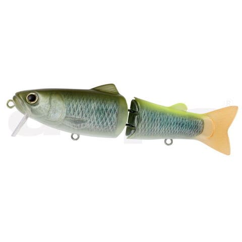 リアルフォルム.クランキング。カバー回避能力に長けた“サイレントキラー”に、あらゆるフィールドに生息するベイトフィッシュサイズへとサイジングされリアルに作り込まれたフォルムにより、カバーに潜むフィッシュイーターに違和感なくバイトへといざなう115mmサイズのジョイントベイト。ソフトシェルに包まれたボディはABS樹脂製中空コアボディが採用され、高浮力によるハイピッチでキレのあるクランキングアクションで、シャロークランクのような感覚でカバー攻略が可能。また瀕死のベイトフィッシュを演出するデッドスティッキングや表層引き、クリアアップ時にも効果的にバイトに持ち込むことができます。ハイピッチなウォブリングアクションを可能にした、高浮力なABS樹脂製中空コアボディをリアルなソフトシェルで覆った独自構造は、限りなく本物に近い柔らかな波動と質感、スプリングウェイトマイクロバイブシステムなどの搭載、クリアカラーの設定などフィールドに合ったカラーバリエーションを可能にし、クリアアップした状況下にも対応。フロントボディのシェルとコアの間に板オモリなど挿入すれば、簡単なウェイトチューンが可能。