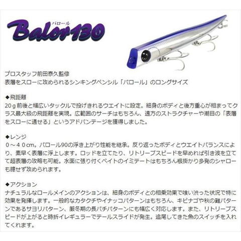 プロスタッフ前田泰久監修!表層をスローに攻められるシンキングペンシル「バロール」のロングサイズ!◆飛距離◆20g前後と幅広いタックルで投げきれるウエイトに設定。細身のボディと後方重心が相まってクラス最大級の飛距離を実現。広範囲のサーチはもちろん、遠方のストラクチャーや潮目の「表層をスローに通せる」というアドバンテージを獲得しました。◆レンジ◆0~40cm。バロール90の浮き上がり性能を継承。反り返ったボディとウエイトバランスにより、素早く表層に浮上します。ロッドを立てたり、リトリーブスピードを早めれば引き波を立てて超表層の攻略も可能。水面に張り付くベイトのイミテートはもちろん根掛かり多発のシャローも臆せず攻められます。◆アクション◆ナチュラルなロールメインのアクションは、細身のボディとの相乗効果で喰い渋った状況で特に効果を発揮します。一般的なカタクチやイナッコパターンはもちろん、キビナゴや秋の難パターンであるサヨリパターン、厳冬期の長バチパターンにも幅広く対応します。