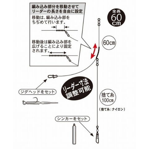 タイプ:逆ダン ハリス:2号 捨て糸:1.5号 全長:60cm 入数:2組 リーダー寸法調整可能。感度重視のショートハリスか喰わせ重視のロングハリスか、状況に応じてその場で変更可能な仕掛です。編み込みを移動させることでハリスの長さが調整可能。その日のアタリパターンにいち早く対応可能な仕様です。