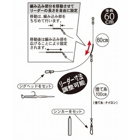 タイプ:逆ダン ハリス:3号 捨て糸:2号 全長:60cm 入数:2組 リーダー寸法調整可能。感度重視のショートハリスか喰わせ重視のロングハリスか、状況に応じてその場で変更可能な仕掛です。編み込みを移動させることでハリスの長さが調整可能。その日のアタリパターンにいち早く対応可能な仕様です。