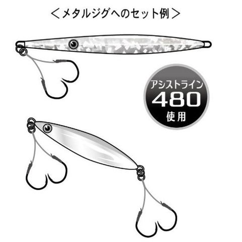 ショートシャンクワイドギャップ形状による素早い鈎立ちが特徴の「ジギングフック鎌斬」を使用したアシストフック。アシストライン480中芯入りを使用しており、ジグ本体のシルエットとあわせることにより、より遠くの魚にアピールできるアシストフックです。
