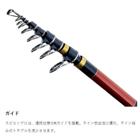 ロッドの強度を保ちながら高弾性化・細身化。細身化に成功したことによりキャスティング時の風切り・振り抜き性能が向上し、飛距離が今までよりも向上すると同時に操作性のアップにも寄与します。また、PCS(パワークロスシステム)を適所に採用することで、ブランクのネジレも防ぎます。カゴ釣りにおいては他の追随を許さない、至極の一振りです。スピニングモデルには糸がらみしにくいKWガイドを採用。従来のガイドセッティングを見直し、#4の固定ガイドを誘導ガイド化。これによりラインの整流効果が生まれ飛距離の向上・ラインの送り出し性能が格段にアップしています。またスクリューシートを採用することで大型のスピニングリールでもしっかりと取り付けることができます。真鯛やイサキなど様々な魚種に対応。タイプ:スピニング 号数:3.5 標準全長(m):5.3 標準自重(g):380 仕舞寸法(cm):125.5 使用材料(%):カーボンファイバー99.1/グラスファイバー0.9 モーメント:52.4 継数(本):5 先径(mm):2.2 錘負荷(号):6-18 適正ハリス(号):3.5-10 ※実物と色が違って見える場合があります。あらかじめご了承下さい。