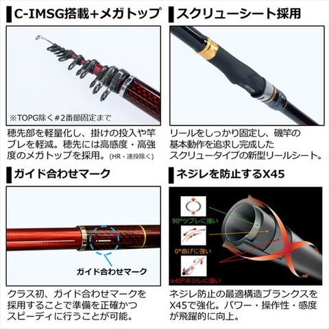 使いやすい機能を満載したダイワ上物竿のスタンダードモデル。振りこみやすく、曲がってしっかり魚を浮かせる使いやすいブランクス設計。あらゆる番手のリールもきっちり保持する新型スクリューシート搭載。FUJI 製カーボン樹脂フレームガイドを穂先部(♯2固定まで)に採用することで、軽快な竿さばきを実現。高級感と光輝性を併せ持つ本体デザイン。■オールラウンドモデル・・・FUJI製軽量カーボン樹脂フレームC-IMSGを搭載(#2固定まで)することで、シャープな振り心地を実現したと同時に糸絡みを減少。食い込みが良く、かつ高感度・高強度ソリッドメガトップに加え、ダイワオリジナルスクリューシート搭載でリールのガタツキを軽減。掛けてからは胴まで力がスムーズに伝わり、タメて獲る調子を実現。(2021年発売モデル)※掲載している商品の画像は代表画像を表示しています。また実物と色が違って見える場合があります。あらかじめご了承下さい。